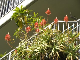 買い物帰りに隣接するマンションを見上げると、7Fのベランダから、身を乗り出すように赤オレンジ色の花を付けたアロエが見えたので、撮影して帰宅後に映像を確認、残念ながらガラ携帯のカメラ機能の限界を超えていた様でピンボケ、カメラを持って現場に戻りました。