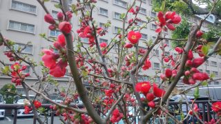 冬枯れで色彩不足のマンションの公園に、濃い紅色の鮮やかな花が一際目立っています、バラ科小灌木のボケ(木瓜)で、品種は「黒光」と思われます。英語では「ジャパニーズ クインス」と呼ばれますが、原産地中国から、平安時代に渡来したものです。