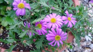 ブラキカムは、オセアニア地域が原産地のキク科植物、オーストラリアで品種改良されたもので、水はけと日光に留意すれば栽培は容易、花の時期が長く、夏の暑さや寒さにも抵抗力があり、マイナス10℃位までならば大丈夫との事です。中心部の黄色い部分は筒状花、青い花弁は舌状花の二重構造に成っています。