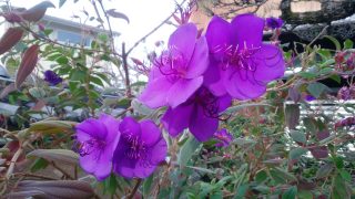 晩秋が気温の高い日が続いた事で、植物のライフサイクルが狂ったのかも知れません。 ブラジル原産ノボタン科の花木なのに、不思議と苔の日本庭園にも馴染んでいます。