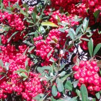 金網に沿って生垣として植えられたピラカンサス、これ程ビッシリ実を付けているのは珍しく、遠くから見れば、まるで赤い壁。 この種は和名で「常盤山査子-ときわさんざし」と呼ばれ、木は常緑で、実が山査子(さんざし)に似ている事 …
