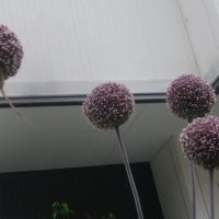 2メートル弱の長い茎の先で、ソフトボール位の球形の物体が風に揺らいでいます。 一頃は花の集合体にそれぞれ紫色がかった小花が咲いて全体的にもう少し綺麗な色だったのですが、日数が過ぎて少し退色して仕舞いました。 ユリ科の植 …