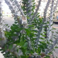 異様な姿の、この植物、草丈は2メートル位、初めて目にして、瞬間的に身構えて仕舞いました。 灰白色の幹には鋭いトゲが有り、ちょっと離れた場所から見ると、まるで動物の骨格標本の様で不気味なものです。 良く見ると、根元に近い部 …