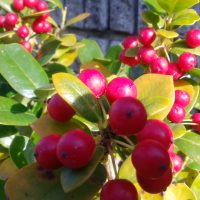 クリスマス目前となり、バックヤードで育て実が綺麗に赤く熟したのが、玄関先に並び始めました。 この株は成長して丸い葉に成っていますが、本来は葉に棘が有って、葉の形状がヒイラギ(モクセイ科)に似ているので、和名で「西洋ヒイラ …