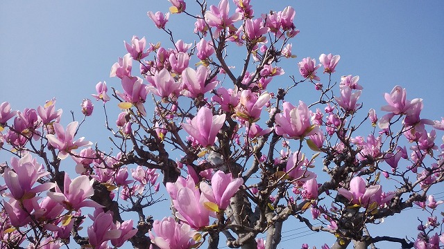 買い物途上の 民家の塀からシモクレンが、青空を背景に綺麗に咲き揃っていました。
