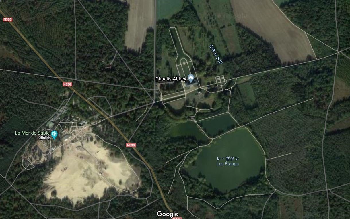 シャンティーの森の東に森続きと言える状態で拡がる33,000ヘクタールのエルメノンヴィルの森。地質はシャンティーと同じ砂岩系で、この森の中程にちょっとした砂丘「砂の海」(Mer de Sabre)があり、その一角に一大遊園地が出来ています。すぐ近くに池(Les Etangs)、があり、そしてそこから程近くに古い修道院(シャーリ修道院”Abbey de Charlis”)があります。