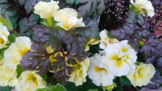 ビオラの花に似ているが鰐が違う、プリムラに似た雰囲気有りますが少し違う、紫がかった色でパセリ状の葉はこれらの花とは結びつきません。 花壇の主に花の名前を聞いても、貰った苗を植えただけなので名前は知りませんと・・・。 この数日間、図鑑や資料で探してみたのですが、これに該当する植物は、見当たらなくてお手上げ、今のところ正体不明です。