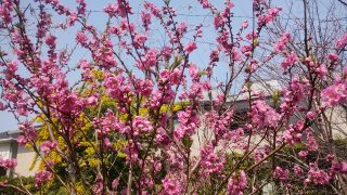 マンションの公園では、気温上昇に伴い競う様に、次々と季節の花が開花を迎えています。 先日満開となった黄金色のミモザの横で、ハナモモの花が見頃に。桃には大きく分けて、果実を食す「実桃」と、花を楽しむ「花桃」があります。