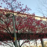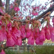 その中間のJR岸辺駅周辺に集中植樹されていた緋寒桜が育ち、近年人目を引く姿になりました。緋寒桜は日本で一番早く咲く桜で、沖縄の石垣島 久米島 それに台湾と中国南部に分布し、別名でヒザクラ(緋桜)やタイワンザクラ(台湾桜)とも