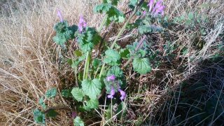 枯草の隙間に、例年3月頃から猛烈な勢いで繁茂してくる「ホトケノザ」が早くも花を付けているのを目にしました。 まだ1月の寒空の下なのに、陽だまりの場所が成長を促進、草姿は弱々しいものです。