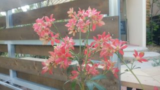 洋菓子店の入り口、生垣に植わった「ケラトペタルム」が、今年もだいぶ色着いて来ました。この花は、切り花としてごく少量輸入されているようですが、この様に植木として栽培されているのを、目にする機会は殆ど無く、大変珍しいものです。