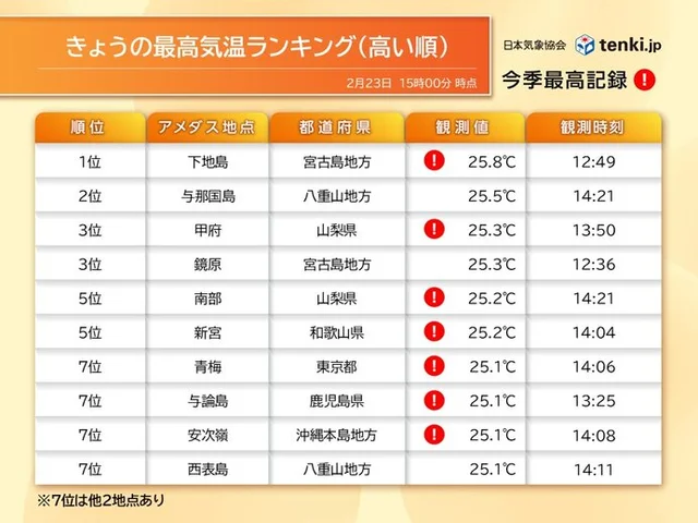 2月23日は、関東甲信から紀伊半島にかけて暖かい空気の流れ込みが強まった。日差しの影響も加わって日中はぐんぐん気温が上がり、午後3時までの最高気温は、青梅市(東京)で25.1℃、甲府で25.3℃、和歌山県新宮市で25.2℃などとなった。