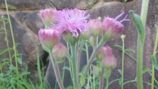 道路際の草叢で一斉に花茎を伸ばしてきました、この雑草の名前は「キツネアザミ」、外見がアザミに似ているが、アザミではなく、まるでキツネに騙されているかの様だと、付けられた名前とか。