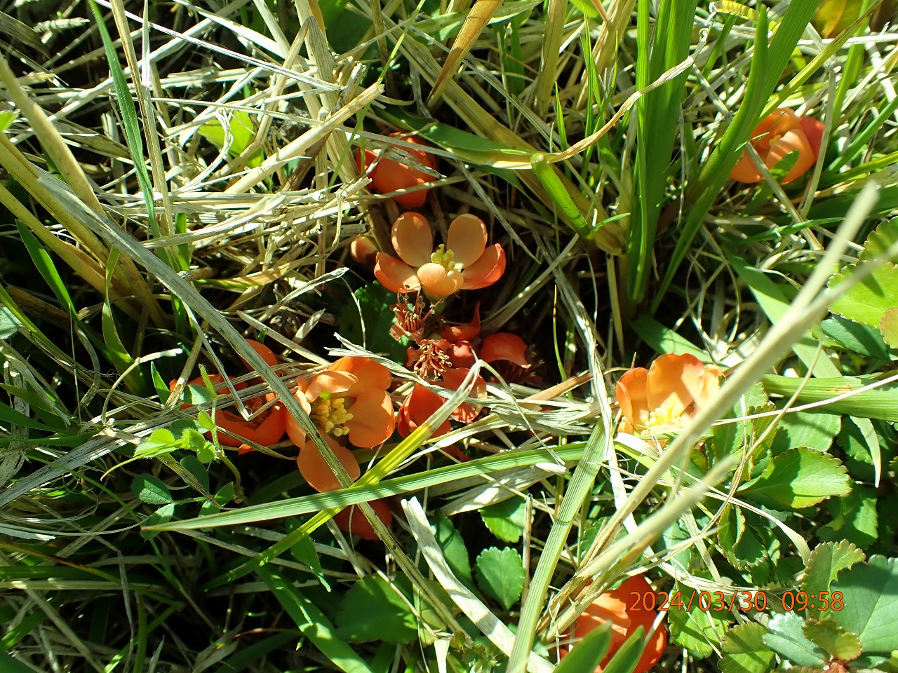 多摩川土手に雑草の中に埋もれるようにクサボケが緋色の花を咲かせていた。