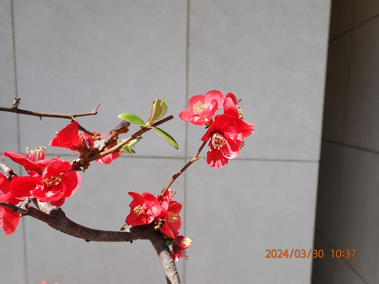 ご近所には木立のボケも真赤な花を咲かせていた。