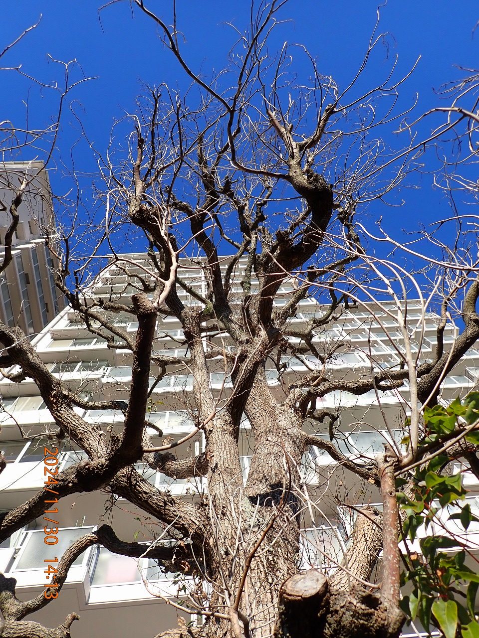 現在は、ほぼ枯れ木の状態になってしまった。常緑樹であるクスノキが、冬場の落葉樹のようになってしまった。