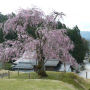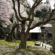 2→九重桜、京都で唯一の国指定天然記念物桜、写真の奥の方で、添え木で支えられている枯れ死寸前樹齢650年の枝垂れ。手前はその子孫の木。