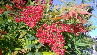 初冬の寒気の元で、ナンテンの実が赤みを増し、陽光で綺麗に輝いているのを目にする機会が増えました。