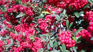 金網に沿って生垣として植えられたピラカンサス、これ程ビッシリ実を付けているのは珍しく、遠くから見れば、まるで赤い壁。