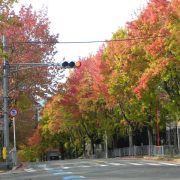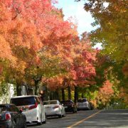 吹田市北部にある人気の街路樹、アメリカフウ トウカエデ タイワンフウの3種の紅葉樹の織り成す色調の組み合わせが作るグラデーションが素晴ら