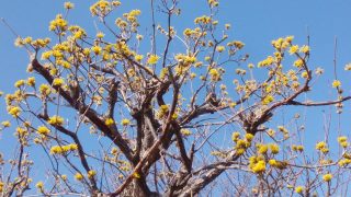 例年花が咲いて春到来を感じているサンシュユ(別名では、牧野富太郎が命名した春黄金花―ハルコガネバナ)ですが、今年は10日以上遅れてやっと黄色、というより黄金色の花をつけました。