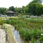 所用で大阪市内に向かって運転している途中、予想外の天候回復となったので、例年この時期に成るとローカルニュースで紹介される菖蒲園を、覗いてみようと思いついて足を伸ばしました。