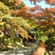 当神社のシンボル十三塔は、世界唯一のもので、この塔を含めた紅葉の写真を撮りたかったのですが、生憎の暖冬の為に紅葉が大幅に遅れています。ようやくカエデの一部に色がつき始めたばかりで、その奥には本殿が透けて見えます、本殿には昇殿出来、沢山の釣り灯篭がぶら下る場で静かな境内の佇まいを眺められます。