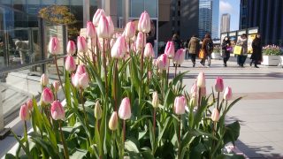 彼と別れたあと、大阪駅の風通しの良い歩道橋の上に、寒風に震え上がるチューリップが目に入りました。おそらく気温が高い時に低温処理でチューリップの球根に冬の錯覚を持たせ、その後 温室で目覚めて成長、春が来たものと思って開花、それが植木鉢に盛られて陸橋の上に置かれたものだと思います。