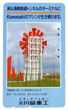 帰国して数年、今から20年位前でしょうか、私のフランスでの長い友人が日本に見えました。彼から貰ったテレカ(写真)が手元にあります。このとき彼から色々とトンネル掘削の話を聞きました。彼はその昔建設省の役人で、工事に関係していたのです。別件での日本出張でしたが、昔の仕事仲間に会ってきたと言います。川崎重工で、同社の掘削機が大変貢献したというのです。海底100m位での掘削で強靭な岩盤を突破できたのは川崎重工の機械があってのことだそうです。そしてその掘削機の記念モニュメントがドーバー海峡入り口近くに建てられたようです。