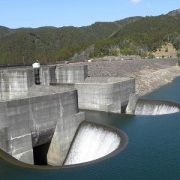 10→滋賀県甲賀市の青土(おおづち)ダム、淀川水系の野洲川流域にある。洪水を防ぐ半円形状の洪水吐(こうずいばき)が2基並び余分な水量を調整している。世界に例のないユニークな構造のロックヒルダム。