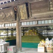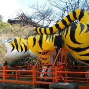 1→境内入口にある世界一サイズの「寅の張り子」人物とサイズを比較してください。 後方に本堂が見えます。